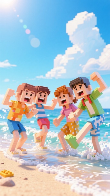 像素风卡通人物在沙滩上悠闲度假,软3D设计带来清新舒适的夏日氛围。