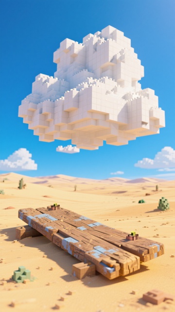 像素风沙漠场景,未来感虚拟现实云朵悬浮,创意设计展现科技与自然融合。