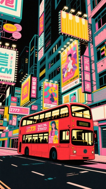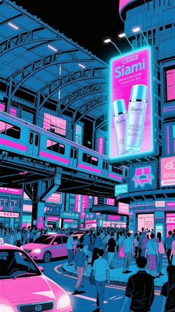 赛博朋克风格城市夜景,雨后湿润的街道反射着五彩斑斓的霓虹灯光,融合东西方建筑风格的未来都市,高耸入云的玻璃幕墙摩天大楼与传统飞檐翘角的中式建筑交相辉映,空中悬浮着全息投影广告和飞行器,两侧建筑上挂满醒目的全息霓虹招牌(展示不同的亚洲文字和英文标识),整体色调以深蓝、紫色为基底,点缀亮粉、湖蓝、明黄等霓虹光色,营造出湿润路面反射灯光的强烈光影对比和神秘迷离的未来都市氛围,场景展现一条充满未来感与传统元素碰撞的繁华商业街道,行人与自动驾驶车辆穿梭其中,充满动感与活力。