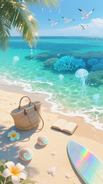俯瞰视角,午后三点的热带环礁湖,绿松石色的海水如液态宝石般分层铺展,从浅滩的透明渐变为深海的靛蓝,珊瑚礁在水下勾勒出蕾丝状的白色轮廓。细腻的香槟色沙滩上,半埋着一个褪色的波西米亚风格草编包,旁边散落着三枚带着荧光边缘的鹦鹉螺贝壳和一本翻开的、书页被海风微微掀起的航海日志。画面左上角,一束被阳光穿透的椰子树叶垂下,水珠正从叶尖滴落,右下角是半浸在海水中的冲浪板,玻璃纤维表面反射着七色彩虹。五只银鸥组成的V形编队掠过远处的海天交界线,而近处的海面上,一群发光的水母正随波浪缓缓浮动,在沙底投下如同跳动的蓝色火焰般的阴影。空气中悬浮着海盐结晶和鸡蛋花的香气分子,色调是明亮的柑橘黄与薄荷绿的交响,光影呈现出被棱镜折射后的梦幻效果,超现实主义插画风格中透着航海图般的精细线条。