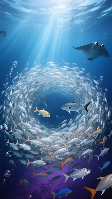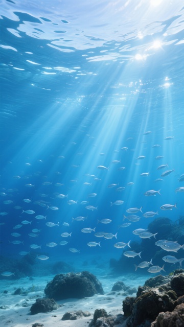 一幅梦幻唯美的海底世界插画,整体采用深蓝色调为主,搭配青色和浅蓝色的渐变,营造出神秘而宁静的氛围。画面中,阳光不再从水面上方直射,而是转变为从画面右侧斜下方照射的柔和光源,光线穿透海水形成一束束倾斜的光柱,在水中折射出斑斓的光晕效果。海底的细沙呈现出细腻的质感,上面覆盖着一些绿色的海草和形态各异的珊瑚礁。一群银色的小鱼正朝着光源的方向游动,它们的身体在光线下闪烁着微光。画面中还点缀着许多大小不一的气泡,从海底缓缓上升。整体构图采用纵深视角,前景的珊瑚和海草清晰可见,中景的鱼群和背景的海水形成了明显的层次感,光线的变化让整个海底世界呈现出一种全新的光影魅力,既保留了原有的梦幻感,又增添了一丝温暖和神秘感。
