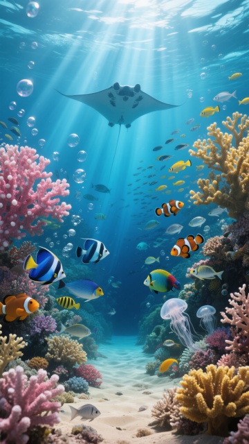 超写实风格的梦幻海底世界全景图,画面中央上方有几道从海面投射下来的强烈阳光光束,照亮整个深海场景,主色调为深浅不一的蓝色与青色,点缀着五彩斑斓的珊瑚和鱼群,光影效果柔和且具有层次感,大量气泡从海底向上漂浮。前景左右两侧布满形态各异的珊瑚礁,左侧有粉红色带白色斑点的大型珊瑚,右侧有黄色和棕色的珊瑚群,中间是一条通向深海的沙质海底通道。画面中各种海洋生物丰富多样,包括在中上方优雅游动的巨型蝠鲼,成群结队的黄黑条纹小丑鱼穿梭于珊瑚间,几只蓝白相间的蝴蝶鱼在中层水域结伴游动,还有色彩鲜艳的鹦鹉鱼、透明的水母以及一些小型银色鱼类在背景中形成流动的鱼群,整体氛围宁静而充满生机,呈现出绚丽多彩的深海生态系统。