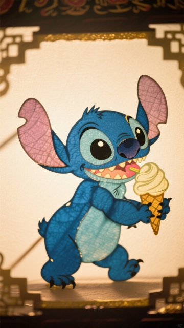 史迪奇手持彩虹伞,置身于星光闪烁的绿意中。