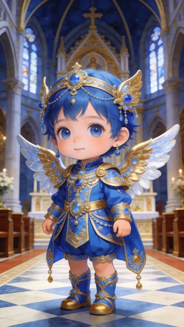 梦幻感与唯美感交织的插画风人物,蓝银相间的古典服饰搭配浮雕纹样边框,玻璃画质感中透出神秘而神圣的静谧气息,宛如冰雪中的优雅仙者。
