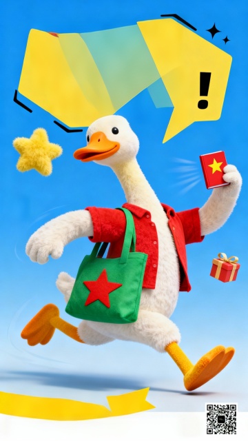 软3D风拟人鸭子,毛发生长质感,卡通感十足,红绿配色喜庆,手持红包与礼物,动感奔跑姿态,节日氛围浓厚。