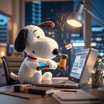 一只史努比勾勾,疯狂砸电脑,夜晚背景。
