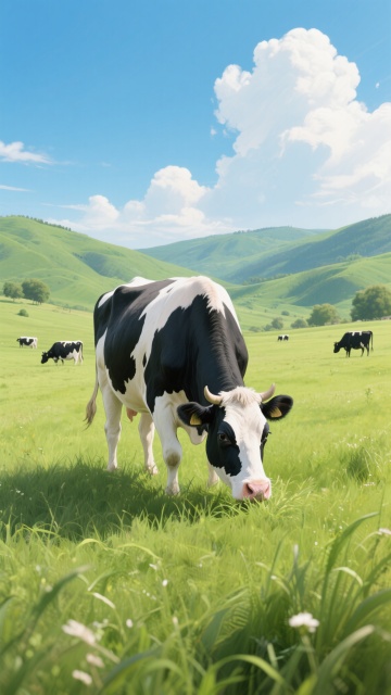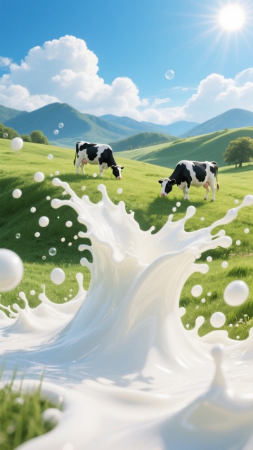 高清晰度3D渲染风格,以明亮阳光照耀下的绿色草原为背景,远处有起伏的青山和白色云朵点缀的蓝天,前景是动态飞溅的牛奶,展现出光滑细腻、富有光泽和流动性的质感,牛奶飞溅形成优美的弧线和众多悬浮的圆润奶滴,草原上有两头黑白花奶牛在悠闲吃草,整体色调以清新的蓝绿色为主,光影明亮柔和,营造出自然、纯净、生机勃勃的氛围,画面层次分明,视觉焦点突出,具有强烈的视觉冲击力和田园牧歌式的宁静美感。