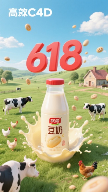 清新3D微缩艺术风,牛奶与大豆在田园中跃动,618狂欢盛典尽显自然魅力。