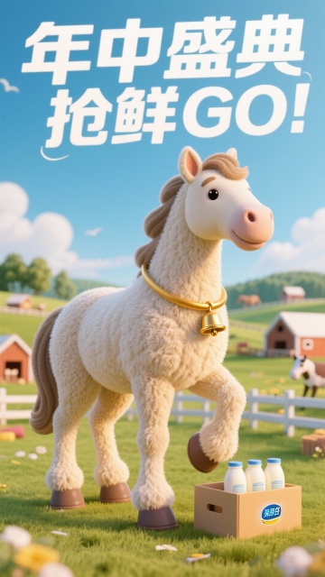 一头拟人化直立的俊马,它是一名画画工。圆润可爱造型,佩戴金色铃铛项圈,蹄子轻扶一箱马奶产品。背后巨大的文字“年中盛典 抢鲜GO”,背景是牧场,上面的字要高清