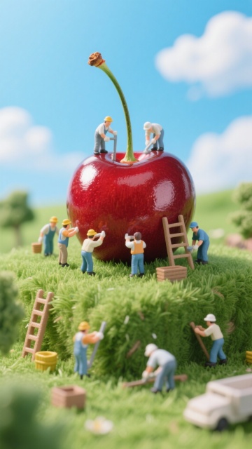 微缩艺术风与拟人风结合,3D质感的巨型樱桃上,小工人忙碌作业,超现实主义场景充满趣味感,粘土风格细腻生动,呈现夏日田园童话。