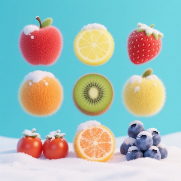 毛发生长风3D水果,覆盖雪霜,柔软蓬松,清新梦幻,虚拟自然与冬日童趣交织。