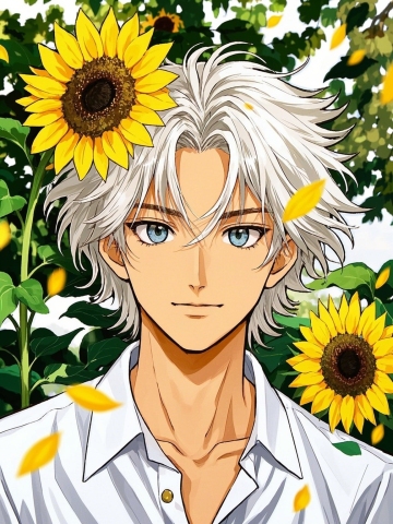 一个帅气的少年,粉发碧眼,帅气阳光,白色衬衫,打领带,型男发型,白皙的皮肤,面部特写,树影斑驳,蓝色花瓣飘落,背景是花海