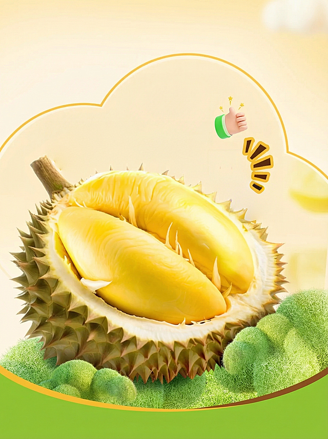 3D重拟物风格榴莲,实景感十足,体积感强烈,质感细腻,呈现饱满果肉与刺状外壳的极致细节。详情