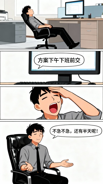 黑白单色插画风,简约线条勾勒职场幽默场景,漫画式分镜讲述放假倒计时突遭加项目,卡通感十足,暗讽节日临近却难享假期的现实。