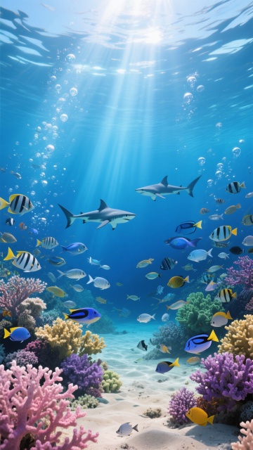 一幅梦幻唯美的海底世界插画,整体采用深蓝色调为主,搭配青色和浅蓝色的渐变,营造出神秘而宁静的氛围。画面中,阳光不再从水面上方直射,而是转变为从画面右侧斜下方照射的柔和光源,光线穿透海水形成一束束倾斜的光柱,在水中折射出斑斓的光晕效果。海底的细沙呈现出细腻的质感,上面覆盖着一些绿色的海草和形态各异的珊瑚礁。一群银色的小鱼正朝着光源的方向游动,它们的身体在光线下闪烁着微光。画面中还点缀着许多大小不一的气泡,从海底缓缓上升。整体构图采用纵深视角,前景的珊瑚和海草清晰可见,中景的鱼群和背景的海水形成了明显的层次感,光线的变化让整个海底世界呈现出一种全新的光影魅力,既保留了原有的梦幻感,又增添了一丝温暖和神秘感。