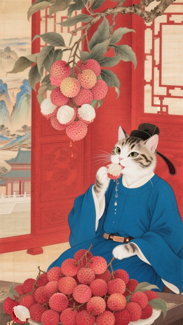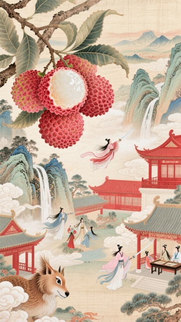 工笔风融合国潮美学,以重拟物手法呈现荔枝与仙侠人物,水墨意境中透出刺绣质感,古典优雅间流淌梦幻唯美之韵。