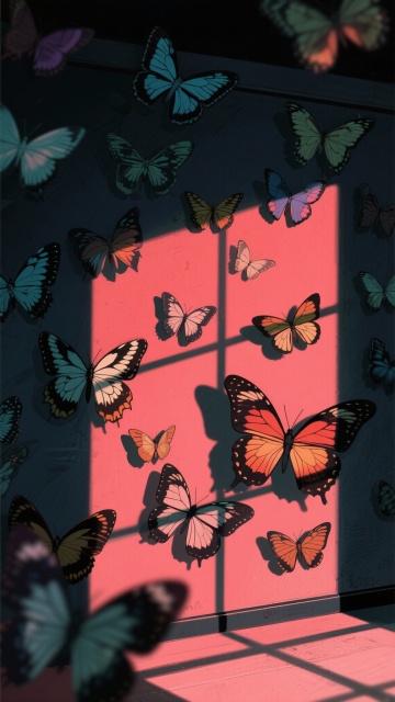 一群透明质感的蝴蝶在深邃的暗紫色背景中飞舞,翅膀边缘散发着柔和的粉紫色光晕,周围点缀着大量梦幻的光斑和光点,整体呈现出神秘浪漫的氛围,光影效果柔和朦胧,具有细腻的散景效果,色调以暗紫色为主,搭配粉紫色的蝴蝶翅膀和白色光斑,营造出宁静而梦幻的视觉感受。