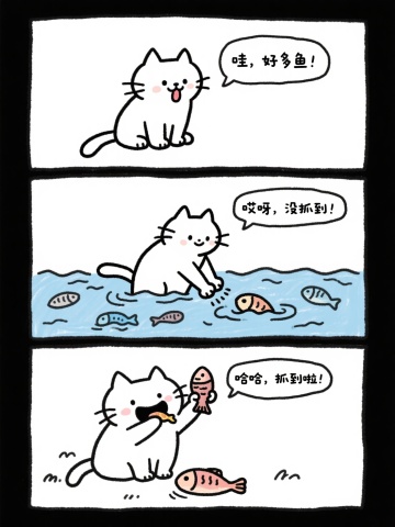 漫画风可爱猫咪抓鱼,表情生动,趣味十足。