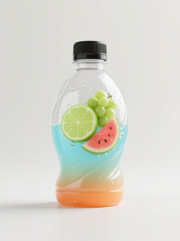 透明PET材质饮料瓶,瓶身呈柔和曲线造型,瓶盖为黑色螺旋盖,瓶身下半部分渐变色彩(可尝试清新蓝、活力橙、静谧绿等不同配色),瓶身中央有立体感的水果图案(如青柠、葡萄、西瓜等不同样式水果),水果表面带有水珠和气泡效果,背景为纯净浅色,整体画面简洁清爽,突出产品主体,具有现代饮料包装的设计感和吸引力。