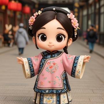 软3D风可爱卡通女孩,身着古风服饰,色彩柔和,童趣盎然。