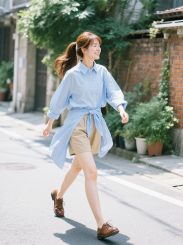 清新感十足的city pop风街拍,手账风色调,少女轻盈漫步,阳光洒落,生机盎然。