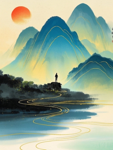 中式水墨插画,古典山水梦幻交织,金线勾勒路径,夕阳映衬诗意。