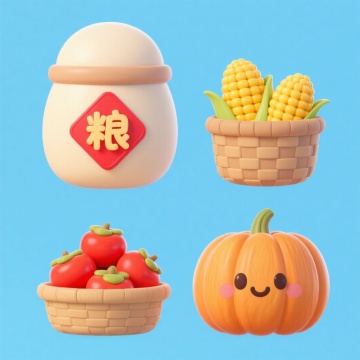 软3D风格的丰收主题插画,拟人化南瓜与卡通感果蔬篮,结合粘土质感与可爱表情,呈现温暖秋日节日氛围。