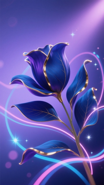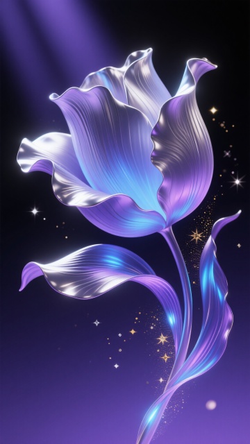 一幅具有高级感的3D渲染花卉插画,画面主体是几片优雅舒展、形态自然的花瓣,花瓣边缘呈现柔和的波浪状,表面有细腻的纵向纹理,质感轻盈如丝绸。整体色调改为深邃神秘的暗紫色为基底,搭配亮银色的花瓣主体,花瓣边缘和纹理处点缀着渐变的蓝色光效。背景为渐变的深紫色到黑色,营造出梦幻而华丽的氛围。画面中融入流畅灵动的炫光线条元素,这些线条从花瓣中心向外延伸,呈现出蓝紫色的渐变光泽,如同流动的光带,与花瓣的形态完美融合。画面中还散布着细小的金色和银色光斑,如同星尘般点缀在花瓣周围和背景中,增强画面的梦幻感和层次感。光线从画面上方斜射下来,在花瓣上形成明亮的高光和柔和的阴影,突出花瓣的立体形态和丝绸般的质感。整体构图采用竖版布局,花瓣从画面右侧向左上方延伸,形成自然的视觉引导线,画面简洁而富有张力,营造出一种神秘而华丽的氛围。