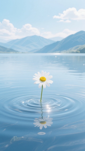 一幅宁静致远的风景插画,以淡蓝色和白色为主色调,柔和而均匀的自然光从上方洒下,水面呈现出细腻的波纹和清晰的光影反射效果,一朵白色花瓣、黄色花蕊的雏菊亭亭玉立地漂浮在水面中央,周围荡漾着层层涟漪,背景是连绵起伏的淡蓝色山脉和飘着几朵白云的浅蓝色天空,整体画面采用写实风格,光影过渡自然,色彩和谐统一,营造出静谧、清新、平和的氛围。