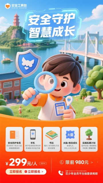 少年手持放大镜化身“小小守护员”,探索校园与自然的安全奥秘。蓝色科技感背景象征智慧与守护,温暖色调突出关爱氛围。结合防护体系、数字安全、知识拓展与实践成长,传递“守护安全,启迪智慧”的核心理念。