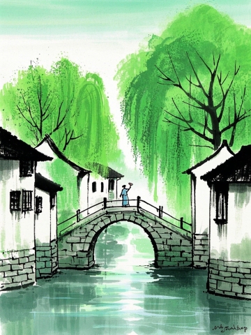清新水墨插画风,中式古桥与绿柳相映,营造宁静雅致的江南水乡氛围。