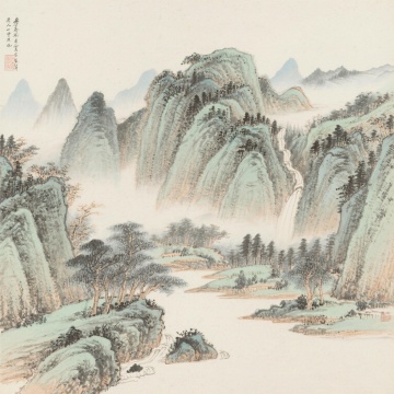 中国传统工笔山水画风格,以淡赭石、石青、石绿为主色调,柔和淡雅的山水意境,近景描绘陡峭的青蓝色山石,石间点缀几株金黄叶片的松树,山脚下有潺潺溪流与散落的鹅卵石,中景为蜿蜒的河流与平缓的绿色坡地,点缀着几座古朴的亭台楼阁与白色小屋,远景是连绵起伏的淡墨色远山与朦胧的水面,整体构图采用散点透视,笔触细腻工整,线条流畅,墨色层次丰富,云雾以留白和淡墨渲染营造空灵之感,变换布局后仍保持传统山水画的气韵生动与深远空间感,无文字及二维码元素。