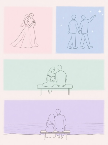 极简风格线条插画,四个不同纯色背景的爱情主题场景规整排布,每个场景均采用流畅、连续的单一线条绘制,线条粗细均匀,无填充色块,保持简约浪漫氛围。第一个场景:身着礼服的男女相拥共舞,背景为浅粉色;第二个场景:两人手牵手在星空下散步,男士指向天空星辰,背景为浅蓝色;第三个场景:情侣依偎在长椅上看书,女士头靠男士肩膀,背景为浅绿色;第四个场景:两人在海边背靠背坐着,眺望远方海平面,背景为浅紫色。所有元素均以极简线条勾勒,保持一致的绘画风格与细腻笔触,整体构图平衡对称,系列感强。