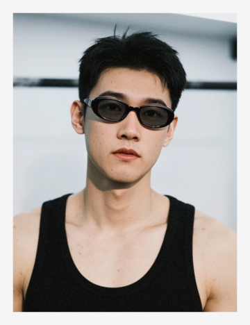 一个男生,狼尾短发,上半部分黑色+下半部分银色头发;戴银色耳钉,穿修身黑t恤