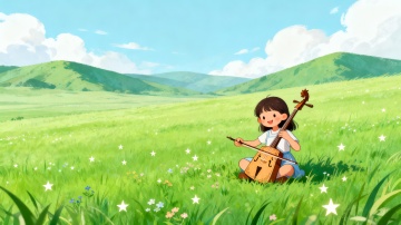 清新森林背景,女孩手捧雏菊,卡通动漫风设计,营造梦幻夏日氛围。