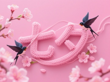 毛绒钩针的粉色“七夕”两字,字体连接着几只喜鹊和桃花,两只3D喜鹊分别拉着“七夕“旁边散出来的绒线,背景是粉色,高纯度配色。