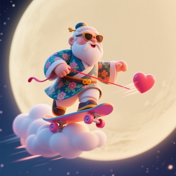 3D卡通风格,拟人化老爷爷滑板云端,手持爱心箭,梦幻超现实主义场景。