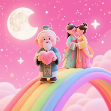 月老怀抱粉绒心站在彩虹桥,古装情侣依偎身旁,粉紫星空下满月皎洁,Q 版形象将七夕的浪漫与童真完美融合。