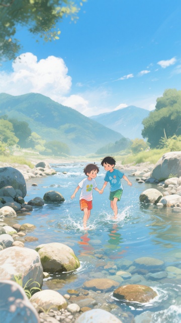 清新水彩插画风,卡通人物在溪流中嬉戏,尽显夏日欢乐。
