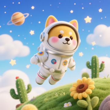 Q版动漫风格插画,可爱的小宇航员,粉色长发编成两条麻花辫垂在宇航服两侧,白色宇航服印有星星图案和"MARS"字样,头盔面罩反射着星光,大大的蓝色眼睛充满好奇,脸颊因兴奋而微红,左手握着迷你星球模型,右手比着"V"字手势,脚踩带有粉色蝴蝶结的白色宇航靴,周围漂浮着土星环、星星和火箭的卡通图标,白色背景突出人物形象,线条圆润柔和,光影明亮柔和,氛围活泼可爱,画面简洁干净,充满童趣。