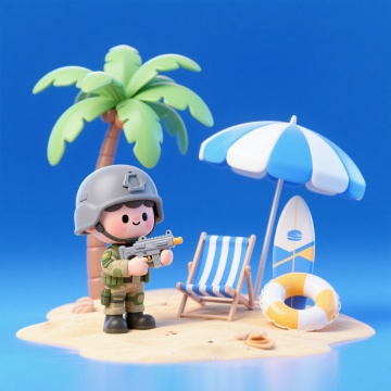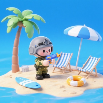 清新软3D风,简约卡通设计,夏日海滩场景,悠闲度假氛围。