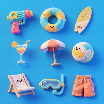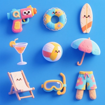 3D卡通风格,充气玩具拟人化设计,夏日海滩主题,可爱趣味十足。