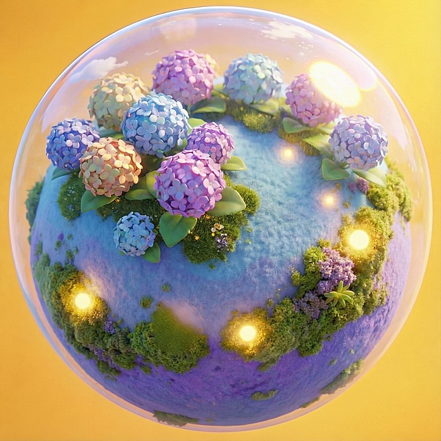 梦幻3D风格,虚拟自然场景,玻璃质感花朵与气泡,营造仙境般氛围。详情
