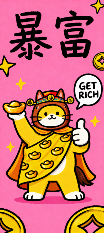 可爱卡通猫叼金元宝,蜡笔风手绘“RICH”与“有钱”,鎏金元素点缀,喜庆插画风,满屏财富祝福。