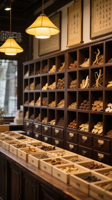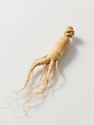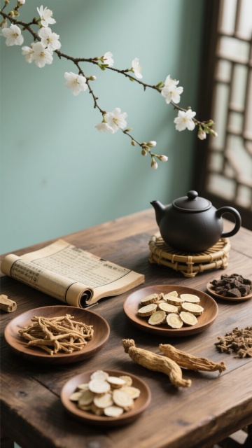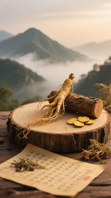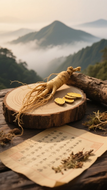 一张具有高度写实摄影风格的中药主题海报,主色调为温暖的棕黄色和土褐色,营造出古朴、自然、沉静的氛围。画面采用柔和的侧逆光,光线从左上方照射,在主体中药上形成明显的高光和细腻的阴影,增强立体感和质感。构图遵循三分法,主要物体集中在画面偏下位置,背景有浅景深的模糊处理。主体为一株完整的、形态饱满的人参,带有长长的须根,放置在一块粗糙的木质树桩切片上,树桩旁有一根横向的枯木枝干。人参旁边散落着几片切好的黄色药材薄片,一小撮干燥的绿色草药,以及一张泛黄的、上面有模糊文字的古老纸张,纸张上也放置了少量药材。背景替换为云雾缭绕的远山,山峰轮廓柔和,呈现出淡褐色调,与前景的中药元素和谐统一,整体画面质感细腻,细节丰富,光影过渡自然,传递出传统中医药的深厚底蕴与自然草本的纯净感。