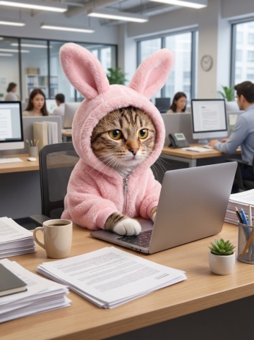 软3D风拟人猫穿粉色兔装办公,可爱感与商务感融合,科技感职场场景,节日氛围轻松萌趣。