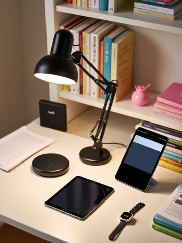 一个书桌,正面摆放着一个 iPad,iPad 上手写字写着“暑期闲聊局,读书博主都买啥”,字迹工整,画面上左下角是打开的浅色格文笔记本,夹子、便利贴等元素装饰,文字排版错落有致,右下角是一杯插着柠檬片、有气泡飘散的冰汽水。背景为虚化的很有文化气息的书柜,摆满了书