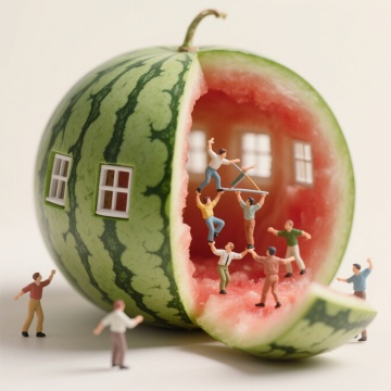 西瓜化身微型房屋,人物在内搭建,趣味微缩艺术风,超现实主义创意设计。