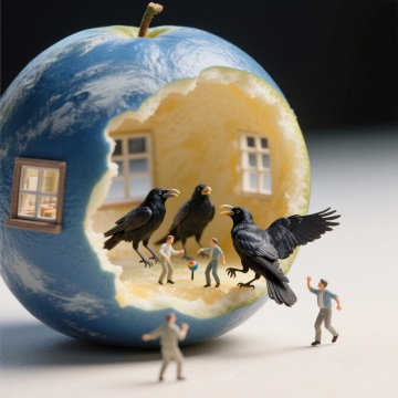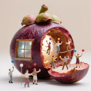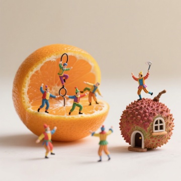 一颗巨大的橘子外壳,果肉被掏空,外壳剥开一块,里面是一群小人在耍杂技,荔枝壳上安了窗户。