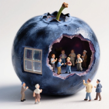 蓝莓内部微缩世界,卡通人物欢聚,趣味感十足,创意独特。